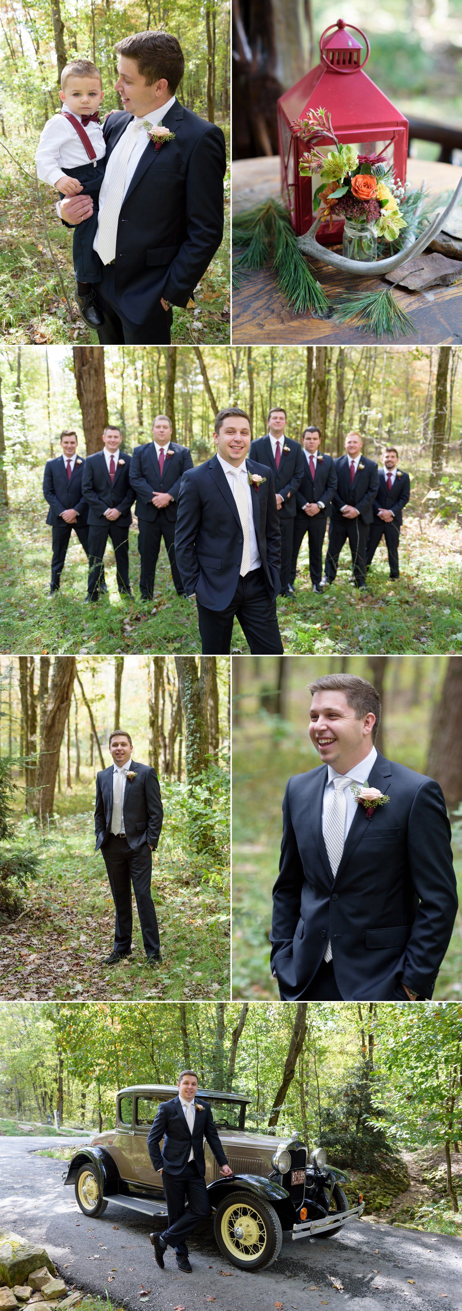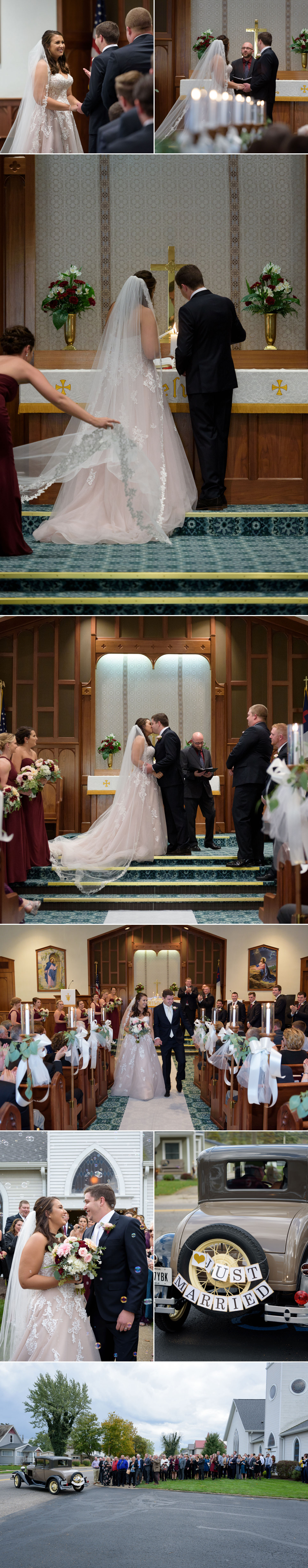 On their special day, Anne wore a stunning blush gown with elegant detail work and a full train. Deep blue heels hid under her dress, and a delicate veil finished off her look. Her bouquet brought together flowers of burgundy, pink, and pale yellow with understated greenery. Anne added personal touches to her bridal look, with a handkerchief from her grandmother and jewelry from her mother. The bridesmaids wore long, burgundy dresses with varying styles of necklines, and soft, romantic updos. Austin and the groomsmen wore deep gray suits, ties, and boutonnieres of a single rose on a bed of green with burgundy ribbon. After a touching ceremony at St. John’s United Church of Christ, the couple drove off in a Model A that belongs to Anne’s grandparents!